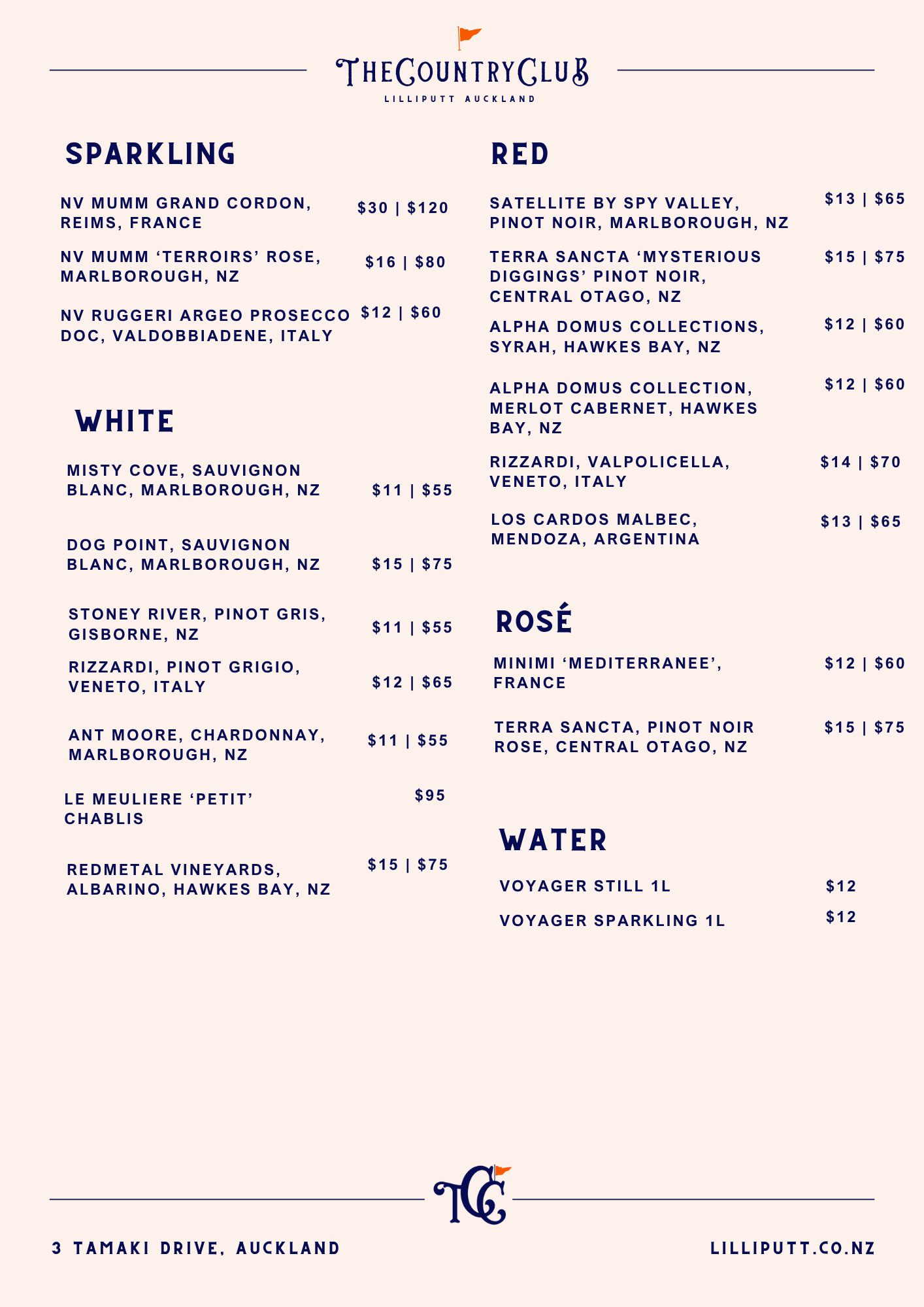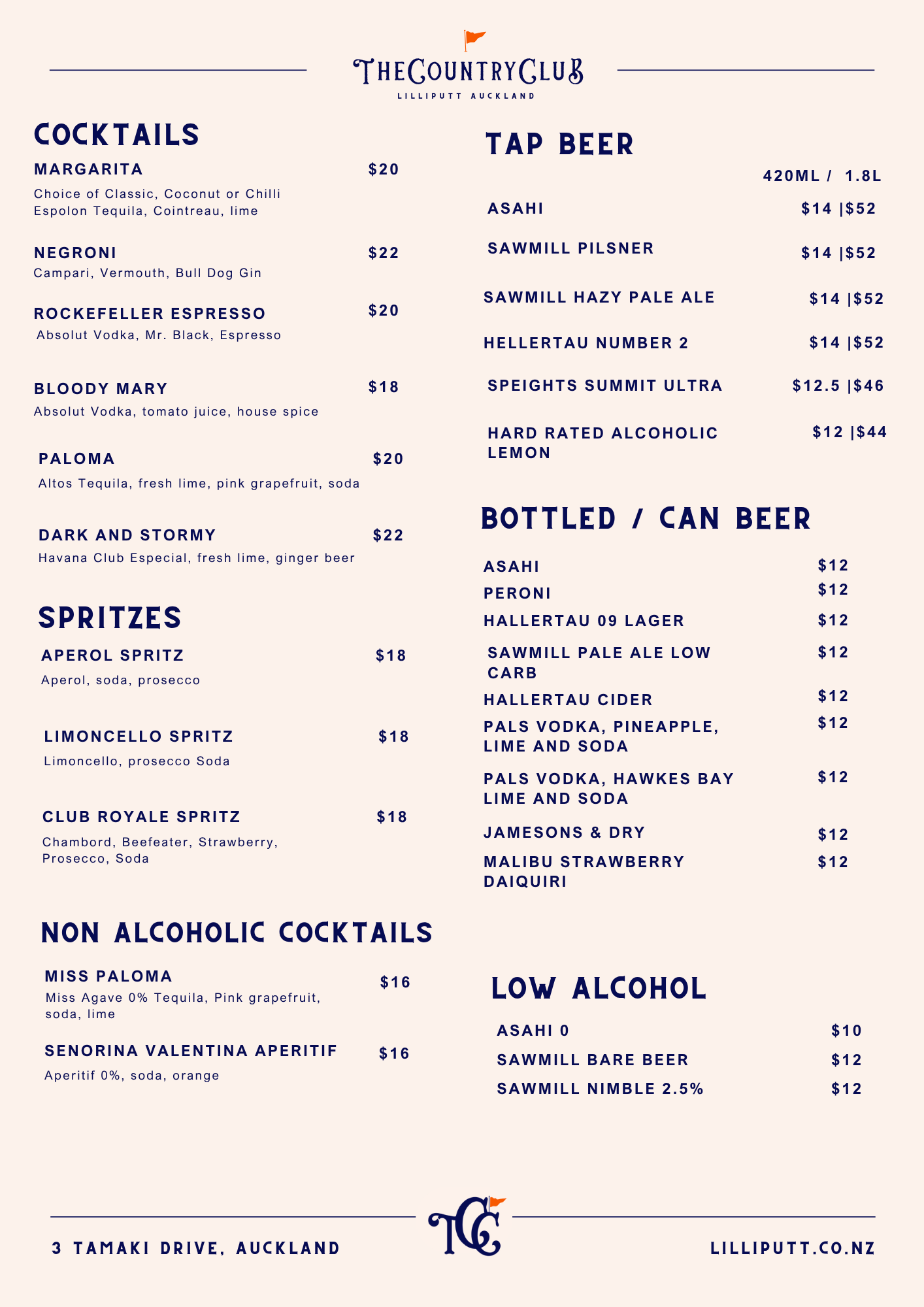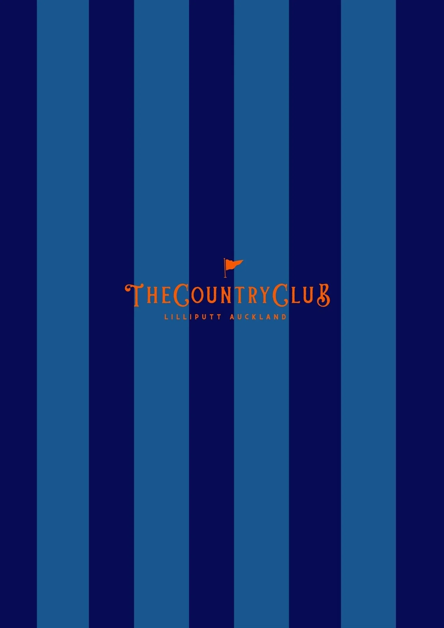 Cover of a publication titled 'The Country Club' with blue and dark blue vertical stripes, a small orange flag, and orange text indicating it is from Lilliput Auckland.